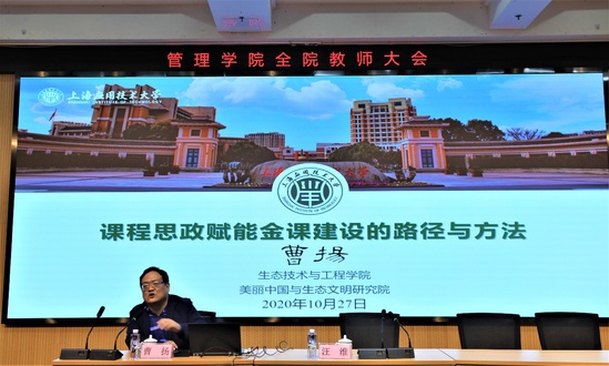 10月27日下午,管理学院邀请上海应用技术大学曹扬教授为学院教师作了题为《课程思政赋能金课建设的路径与方法》专题报告。报告由学院党委书记汪维主持,管理学院党政领导班子成员、全院教师聆听报告。