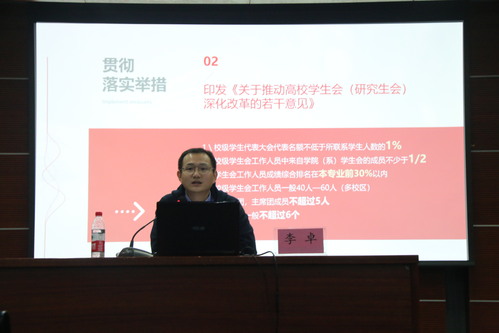 同日下午,上海市团委学校工作部李卓作主题为《全国学联二十七大精神解读》的专题讲座。李卓从全国学联代表大会的地位、职权等基本情况引入,详细介绍了上海市学生联合会的成立、架构等情况。之后,他对全国学联二十七大的内容及其精神作了重点讲解,并引导同学们主动置身于党对青年工作和青年的要求中去思考去谋划,主动置身于新时代的背景下去思考和谋划,主动置身于校园治理的背景下去思考和谋划。