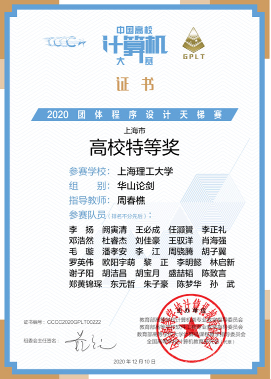中国高校计算机大赛-团体程序设计天梯赛是由教育部高等学校计算机类专业教学指导委员会、软件工程专业教学指导委员会、大学计算机课程教学指导委员会、全国高等学校计算机教育研究会主办,2019年列入全国普通高校学科竞赛排行榜。竞赛重点考查参赛队伍的基础程序设计能力、数据结构与算法应用能力,竞赛题目均为在线编程题,由在线程序裁判系统自动评判。难度分为基础级、进阶级、登顶级3个梯级。每个团队10人组成,以个人独立竞技、团体计分的方式进行排名,通过团体成绩体现高校在程序设计教学方面的整体水平。