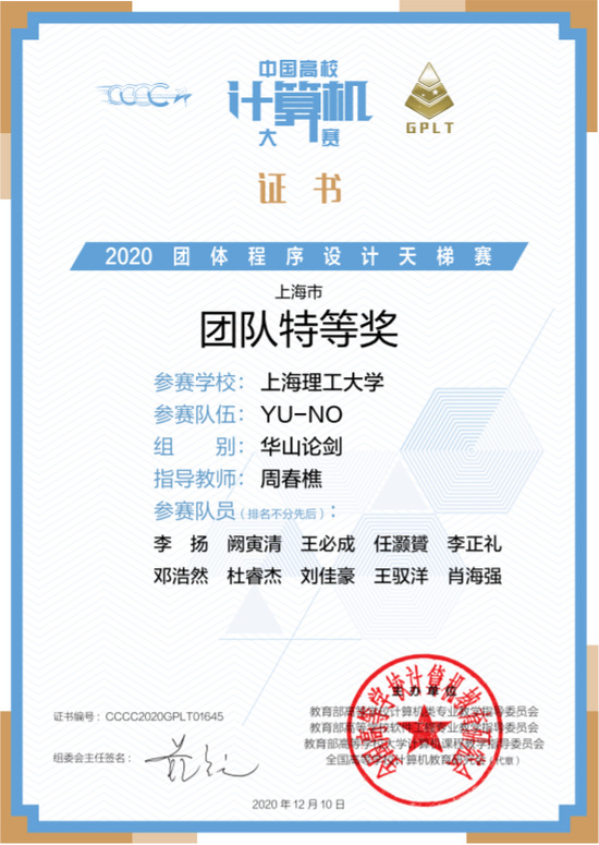 近日,在第五届中国高校计算机大赛团体程序设计天梯赛中,永利官网3支参赛队伍30名选手在获得上海市高校特等奖1项,团队特等奖1项、二等奖1项的基础上,在全国总决赛中又取得全国团队银奖2项,个人一等奖1项、三等奖9项的优异成绩。