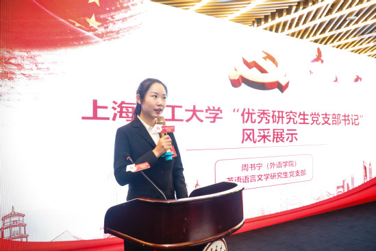 学校党委常委、组织部部长孙红宣读了2020年学生党建评优表彰名单。随后,研究生党员标兵代表机械工程学院高朋帅,优秀研究生党支部书记代表、外语学院周书宁,研究生样板党支部代表、环境与建筑学院暖通研究生党支部陈倩茹分别作风采及工作展示。高朋帅谈到,“不惰者,众善之师也。要时刻牢记自己的党员身份,在自己的领域中当一颗坚固的螺丝钉,成为一粒无限可能的种子,做一面迎风猎猎的旗帜,永远是冲锋在前的战士”。周书宁从“个人发展,引领支部起航”、“支部运转,加强作风建设”、“支部法宝,焕发党建活力”、“工作感悟,面向未来发展”四个方面作了经验分享。陈倩茹围绕《筑基石 热传递》主题,分享了暖通研究生党支部通过热辐射、热对流、热传导的方式传递着上理研究生基层党建工作的“无限热”。