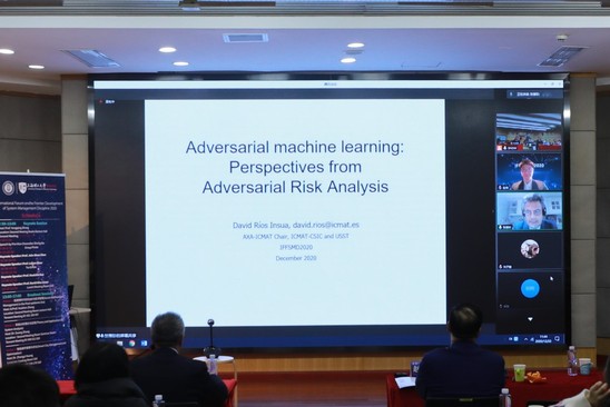 随后召开的主论坛上,陈界山以“支持向量机和信号重建的平滑策略”(Smoothing strategies for support vector regression and signalreconstruction)为题,结合数据科学中的优化问题深入浅出地介绍了光滑策略在支持向量回归与信号重构中的理论及应用;赵来军以“构建中国无缝化应急管理体系的系统思考”(The systematic thinking on constructing theseamless emergency management of China)为题,从专业的视角出发分析突发事件管理的复杂性,介绍了当前我国应急管理体系的现状及主要问题,分享了安全韧性理论和无缝隙化组织理论的进展和实践,并给出了对策建议;高怀珠以“智慧与健康城市复杂系统创新与管理—交通、空气污染、及公众健康综合建模与量化分析”(Systems innovation and management towards smartand healthy cities: integrated modeling and analysis of transportation, airpollution, and public health)为题,分享了如何用系统管理的思维方式与分析方法在城市交通、空气污染和公共健康领域进行建模分析的经验;David Ríos Insua以“对抗性机器学习:对抗性风险分析”(Adversarial Machine Learning:Perspectives from Adversarial Risk Analysis)为题,从对抗风险分析的视角介绍了在对抗机器学习领域的科学研究进展。