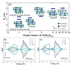 Ti-Nb-O电极材料体系中氧空位的生成能与浓度和位置的关系及其对材料态密度的影响图