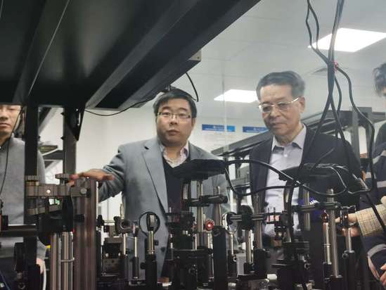 图为庄松林(右)与詹其文(左)在实验平台前展示飓风光场。王烨捷摄