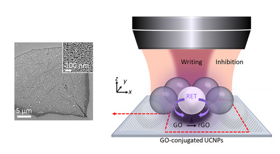 此外,此技术使用一种新的纳米复合材料,将氧化石墨烯与荧光上转换纳米颗粒结合在一起,使用荧光上转换纳米颗粒将亚衍射信息位写入纳米复合材料,在结构光照明下局部还原氧化石墨烯,还原氧化石墨稀的过程通过共振能量转移来完成,从而降低能耗,延长光学器件的使用寿命。同时,与传统光学写入技术使用昂贵且笨重的脉冲激光器相比,此技术使用便宜的连续波激光器,大大降低了成本。