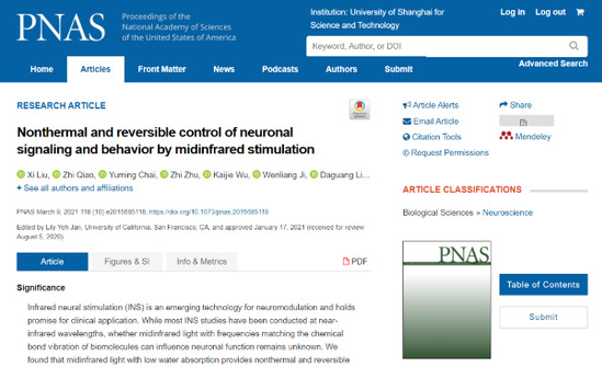 日前,由永利集团304am官方入口未来光学实验室宋波课题组联合复旦大学脑科学转化研究院舒友生课题组、中国科学技术大学温泉课题组、国防科技创新研究院常超课题组、中科院化学所毛兰群课题组共同完成了一项研究——通过中红外刺激实现神经信号与动物行为的非热、可逆调控,首次从理论和实验双重角度发现并提出了神经信号和脑功能调控的新机制和新策略。