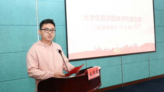 宣讲团团长李豪男同学代表宣讲团在发言中表示,宣讲团将在学校相关各部门的关怀帮助下,在各位老师的指导下,潜心研究党史,走进学校学生党(团)支部、社团及周边社区基层讲好党史故事、传承建党精神。