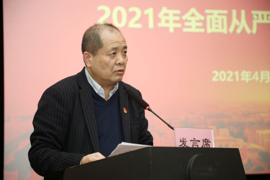 4月16日下午,学校2021年全面从严治党干部大会在综合楼报告厅召开。会议由校长丁晓东主持,党委书记吴坚勇出席并讲话,全体校领导、中层干部、纪委委员、二级党组织纪检委员和兼职纪检监察干部参加了会议。