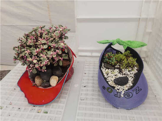 在这里还能看到一个个用废旧帽子做成的花盆,里面种植了各种多肉植物。“这些帽子经过了特殊硬化处理,所以能起到花盆的作用,实现变废为宝。”一位大学生介绍说。