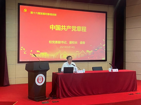 5月14日晚上,培训班邀请校党委副书记、副校长盛春为学员详细解读《中国共产党章程》。他从习近平新时代中国特色社会主义思想、党章的概述、党章的发展历程、党章的总纲、党章的条文和学习十九大党章六个方面展开了深入浅出的讲解。尤其重点对党章发展的四大体系、七次具有重大历史意义的大会上通过的党章以及党员权利义务做了详细的解读。同时,他结合学员的学习生活实际,提出了具体的要求,希望学员们按照总书记对学习党章的四点要求,认真学习和遵守党章,努力做到五个结合,加强四个修养,全面掌握党章的基本内容,严格遵守党章的各项规定,做学习党章、遵守党章的践行者。