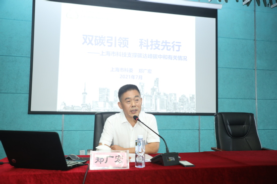 上海市科委社会发展处处长郑广宏以“双碳引领,科技先行”为题作专题报告。他结合长期在生态环境领域的研究成果和管理经验,从碳达峰、碳中和的提出、世界主要国家碳中和的政策和行动;国家和上海市的相关政策、行动方案、科技创新工作部署等方面进行深入讲解,倡导以科技创新控制增量、减少存量,为破解“双碳”之难、回答“双碳”之问、实现“双碳”目标提供了有益的借鉴。