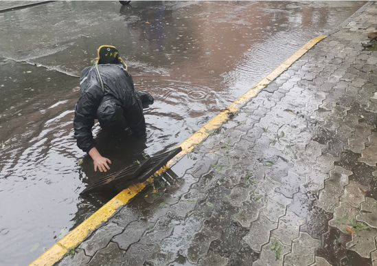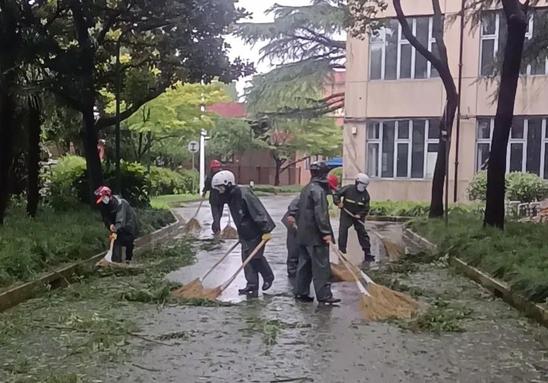 上海财经大学后勤保障人员冲在第一线,应急抢险队伍时刻待命,台风中,不畏风雨,坚守岗位,清扫校园,疏通管道,及时处理、及时上报,维护健康平安校园,保障师生安全度汛。