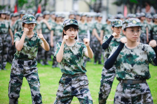 灼灼的烈日动摇不了少年的信念,挥洒的汗水涣散不了少年的精神,疲惫的身躯消磨不了少年的斗志。从僵硬到自然,从篮球场到林荫道,从晨曦微露到暮色四合,在训练的磨砺中,上理新人们少了份柔弱娇气,多了份坚毅勇敢,迷彩帽下的目光愈发闪亮、炙热。
