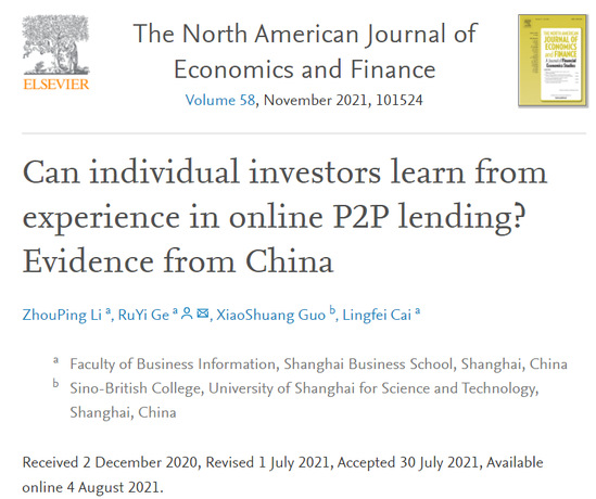 近日,中英国际学院教师郭晓爽以合作第二作者身份在国际知名期刊SSCI期刊《北美经济与金融学报》(The North American Journal of Economics and Finance)发表题为《个体投资者能够从经验中学习吗?来自中国网贷的证据》(Can individual investors learn from experience in online P2P lending? Evidence from China)的研究论文。该论文利用中国网贷账户级数据,研究了投资人初始能力与退出行为的关系,将学习行为分解为改善投资绩效与了解自身能力两种模式,并深入分析了这两种学习模式与投资人经验之间的关系。