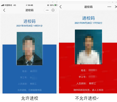 师生进校时,只需刷校园卡或扫描电子校园卡二维码,无需出示“进校码”,刷卡显示“蓝色”则无需查验随申码,快速完成入校。刷卡显示“红色”或“黄色”按照提示要求进一步查验相关信息。为保障入校快速通畅,建议入校的师生提前准备好校园卡或提前打开电子校园卡二维码。国庆假期间人员流动大,期间门岗将加强对返校师生的行程码查验。