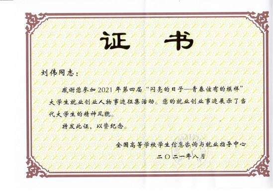 近日,2021年全国第四届“闪亮的日子——青春该有的模样”大学生就业创业人物公布,永利官网环境与建筑学院博士生刘伟的创业事迹入选大学生就业创业典型事迹,获得全国表彰,这是永利官网学生首次入选就业创业典型人物。
