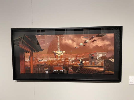 “中华·天梯”描绘了22世纪中国在类似火星的卫星上建设的太空电梯及周边太空城市场景。“作品展现的是中国在一个类似火星的卫星上建立了自己的基地,前景中的古建筑表达的是中国人的乡土情怀,可以称之为‘中华风情区’。近处的传统建筑与远处的灯光闪烁的轨道电梯、城市、飞车形成对比,这就像是全球各地的华人街,不论在哪你都能感受到中国文化,希望通过这幅作品去表达自己对于未来中国在太空领域的发展以及对中国航天技术发展的想象,表达我对中华文化的信心。”赵力表示。