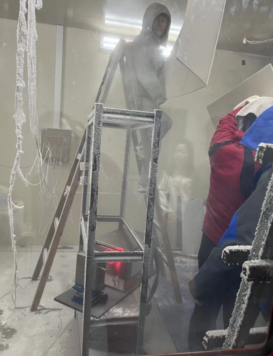 “实验工作量大,环境恶劣,我们团队工作很辛苦,特别是六名研究生,他们几乎每天都会来造雪实验室做实验。”赵巍表示,这些学生十分刻苦认真,为了减少冷风对造雪机产生的影响,他们会举着挡风板,“人肉”站在冷风机风口前,在零下十五度的冷风中,经常会被吹得瑟瑟发抖。