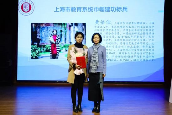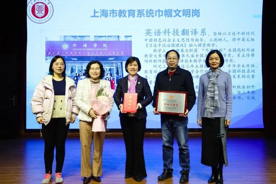蔡永莲为上海市教育系统“巾帼文明岗”外语学院英语系(科技翻译)颁奖