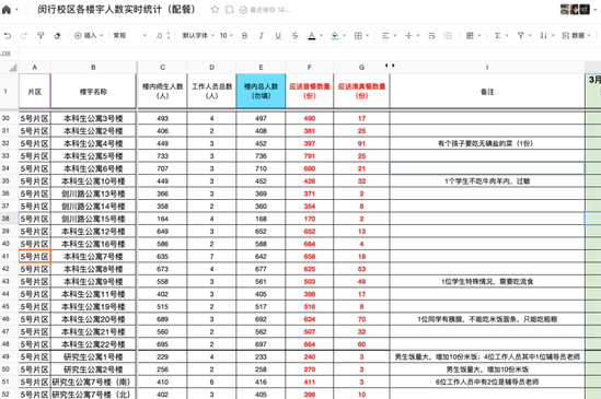 “8600,16438,16330……”这一串数字是华东师范大学每一餐动态统计的配餐数量。目前,学校启动网格化精细管理,尽量做到精准统计,减少浪费。在特殊时期,华东师大还通过在线共享表格,尽最大的努力收集学生需求,单独供餐。从3月19日起,学校每日早餐还配送水果,尽力保证学生在闭环管理期间用餐规律、营养均衡,不仅吃饱还要吃好。