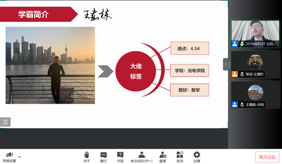 目前,已有160名优秀学长学姐加入学霸导师团,学校的学业帮扶工作已经全面转到线上,帮助同学们形成“学习——复习——练习”的完整线上学习链。除了“学霸课堂”,还有聚焦科技创新的“江畔聆海人文沙龙”、分享学习经验的“线上学习经验分享会”、解决个体疑惑的“一对一”咨询活动……有针对性地帮助同学们巩固学习内容、夯实学业基础。