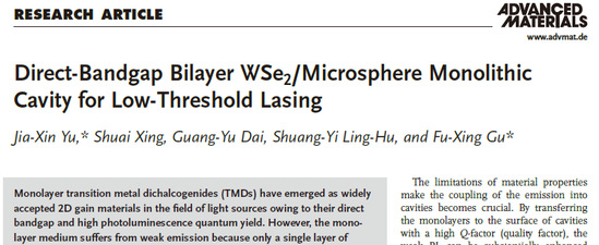 近日,庄松林院士领衔的未来光学实验室、谷付星教授课题组在国际权威期刊《先进材料》(Advanced Materials,影响因子30.849)上发表了题为“用于低阈值激光的直接带隙双层硒化钨(WSe2)/微球一体腔”(Direct-Bandgap Bilayer WSe2/Microsphere Monolithic Cavity for Low-Threshold Lasing)的研究成果。该论文由谷付星教授和于佳鑫副教授为共同通讯作者,于佳鑫副教授与博士生邢帅为并列第一作者。该研究工作的方案设计、实验、模拟工作均在永利集团304am官方入口未来光学实验室完成。