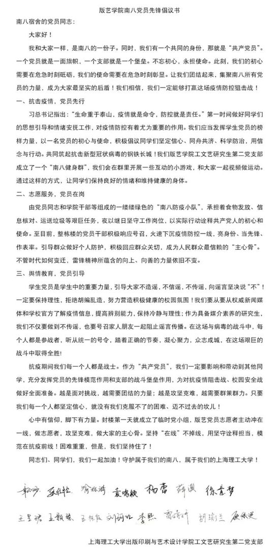 版艺学院南八研究生党员在封楼第一天便成立临时党小组,在抗击疫情、志愿服务和舆情管理方面共同发起倡议,并手签先锋倡议书主动冲在一线,做大家的主心骨。整栋楼党员干部积极响应号召,火速下沉疫情防控一线。