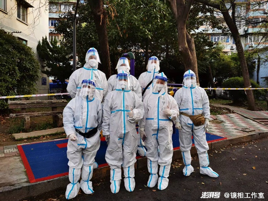 4月1日早上5:00起床,5:30居委会集合,自己看着视频教程换上了“大白五六件套”:防护服、鞋套、手套、纱帽、面屏、口罩。我们互相帮忙在衣服上写下了名字,也在小花园留下了我们组的的第一张合影。