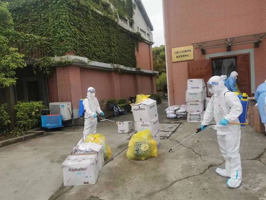 学生楼宇、公共区域、进校物资等各项消杀工作,看起来似乎只是简单重复地喷洒消毒药水,但是由专业消杀队伍和教工志愿者组成的“360卫士”团队,几乎每天都要背上十几斤重的消毒药水筒,穿梭往返于校园各个角落,对重点区域进行360度全覆盖无“疫”角的全面消杀。每当接到消杀任务,“360卫士”都会第一时间奔赴现场,立即开启战疫模式。对物资进行初次消杀后,分派前还会再进行一次彻底的“六面消杀”,确保送达每位师生手中的物品都是安全的。而当脱下“大白服”时,卫士们往往都是满脸通红、气喘吁吁。