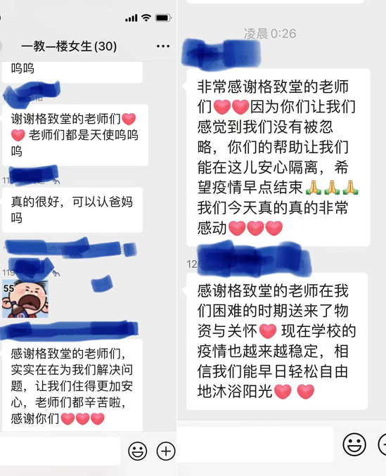 在北区一教观察点,类似的场景也在上演。“格致堂的老师都是天使!每一个问题都认真回答,我们有啥需求都会尽力满足,太感谢了!还给我们拿来了自己的零食、瑜伽垫、床,一教越来越有家的感觉了……”陈杉杉同学在微信群里激动地说道。原来,由于转移仓促,观察点同学们基本都面临着物资紧缺的难题。接到学生求助后,格致堂老师们积极回应、快速收集,半小时左右就能将日用品、文具等相关物资送到观察点。