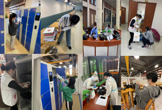 在读者视频指引下,逐一确认、取出因临时闭馆滞留在各楼层寄包柜、置物架等处的海量图书资料,经过紫外线消毒机“零死角”消杀后,进行打包、拍照存档,最后不忘贴上一张“防疫精神食粮”……在与学生处、志愿者队伍的通力协作下,4月17日一天之内,图书馆全体在馆人员通过线上线下高效联动,完成了百余名师生的取书需求。