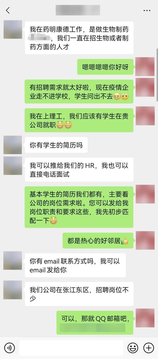 “各位邻居好,大家都接龙购买生活物资,我也推销一波自己的学生……专业有生物医学工程、食品和制药工程。各位热心邻居的公司如果正好也招人,岗位也合适……看到邻居们这么热心有爱,我也发上来试试,万一有机会呢!”4月初,朱旭老师在上海浦东张江镇某小区的社区群发出了这样一条信息,一开始心里也“没底儿”……