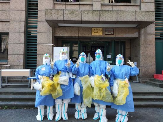 校内核酸采样组志愿者做好防护,准备进楼采样