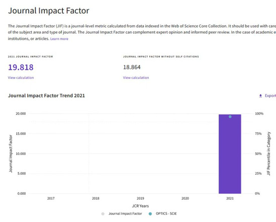北京时间2022年6月28日,科睿唯安(Clarivate Analytics)正式发布最新《期刊引证报告》(Journal Citation Reports, JCR 2021),中国光学工程学会会刊PhotoniX斩获首个影响因子:19.818,在JCR 2021收录的101种光学期刊中排名第4,位列Q1区。