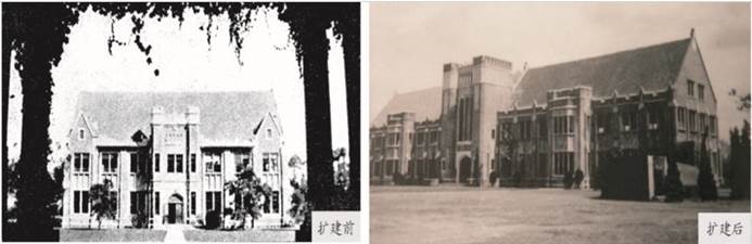 图书馆为砖木结构建筑。长条形平面轴线对称,清水红砖外墙,双坡红瓦屋顶,立面中部凸出平顶城堡式塔楼,尖券门洞形成建筑主入口,墙面壁柱层层内收,突出屋面形成雉堞式装饰。