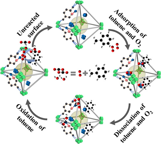 在光催化降解VOCs领域,张晓东副教授针对UiO-66中光生电子的配体-金属电荷转移跃迁并不令人满意等问题,证明了通过Zr-P键提供的原子级电子传输通道,增强UiO-66中的Zr原子向黑磷的电荷转移;通过原位红外技术与色谱-质谱联用等表征手段,阐明甲苯与邻二氯苯在该体系下的降解机制。相关研究成果以“稳定黑磷封装在多孔网状UiO-66中促进电荷转移以实现光催化氧化甲苯和邻二氯苯:性能、降解路径和机理”(Stable black phosphorus encapsulation in porous mesh-like UiO-66 promoted charge transfer for photocatalytic oxidation of toluene and o‐dichlorobenzene: Performance, degradation pathway, and mechanism)为题发表在国际高水平期刊《ACS 催化》(ACS Catalysis,DOI:10.1021/acscatal.2c01375,中科院大类一区)上。