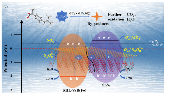 在光催化降解液相污染物领域,张晓东副教授与环建学院刘宁副教授、上海大学唐量教授合作,通过简单的溶剂热法在MIL-88B(Fe)前驱体上制备了几种新型铁基复合材料,并将其应用于过硫酸盐(PS)活化剂和光催化剂,以协同去除水中的布洛芬(IBP)。该研究为合理设计ReSFe以及SnSFe复合材料作为光辅助芬顿型催化剂提供了一种新方法,在废水处理中具有潜在应用。相关研究成果以“ReS2/MIL-88B(Fe)可见光催化活化过硫酸盐高效降解布洛芬的研究:实验和理论研究相结合”(Insights into the photocatalytic activation persulfate by visible light over ReS2/MIL-88B(Fe) for highly efficient degradation of ibuprofen: Combination of experimental and theoretical study)为题发表在国际高水平期刊《分离和纯化技术》(Separation and Purification Technology,DOI: 10.1016/j.seppur.2022.121545,中科院大类二区)上;相关研究成果还以“SnS2/MIL-88B(Fe) Z型异质结在可见光辅助下激活过硫酸盐以增强降解布洛芬”(Visible-light-assisted persulfate activation by SnS2/MIL-88B(Fe) Z-scheme heterojunction for enhanced degradation of ibuprofen)为题发表在国际高水平期刊《胶体和界面科学杂志》(Journal of Colloid And Interface Science,DOI: 10.1016/j.jcis.2022.06.099,中科院大类一区)上。