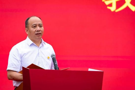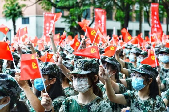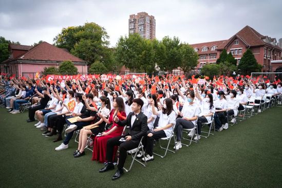 全体师生挥舞着党旗和国旗,齐声合唱校歌