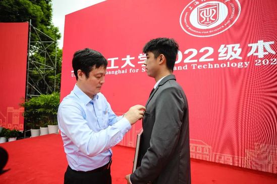 丁晓东为新生代表佩戴永利集团304am官方入口徽章并赠送《悦读:百年上理历史保护建筑》