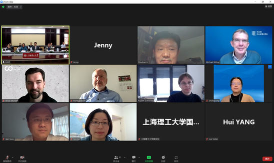 10月18日下午,中德国际学院联合管理委员会第九次会议以线上线下相结合的方式召开,副校长、中德国际学院院长蔡永莲,副校长张华,本科生院、国际交流处、财务处、中德国际学院、机械学院及光电学院负责人和项目负责人参加会议。德国汉堡应用技术大学德方项目负责人胡特教授(Michael Röther)、富特旺根应用技术大学德方项目负责人郝赫教授(Markus Hoch)、科堡应用技术与艺术大学德方项目负责人维克教授(Michael Wick)和东巴伐利亚雷根斯堡应用科技大学德方项目负责人席莱内尔(R. Schreiner)教授在德国通过视频方式参会。会议由张华主持。