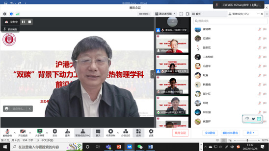 主题报告环节,窦院士作了题为“加强国际合作,实现科技进步和2050年净零排放目标(Strong International Cooperation to Achieve Advances in Sci and Tech and Net Zero Emission Goal in 2050)”的报告,强调了合作对于学科发展以及学术研究的重要性。香港科技大学的邱惠和教授作了题为“电力电子和电池热管理的多尺度表面(Multiscale Surfaces for Thermal Management of Power Electronics and Batteries)”的报告,介绍了电池及电子器件热管理的相关科学问题及重要成果。豆斌林教授作了题为“原位碳捕集吸附强化重整制氢”的报告,探讨了氢燃料电池的发展优势以及制造及使用过程中的关键问题。香港科技大学的梅玫博士及两所学校的5位博士研究生(钟绍庚、闫阳天、叶欣、王孟、张佩)作了关于“双碳”背景下的相关科学问题的学术报告。学者、学生在线上积极参与交流。