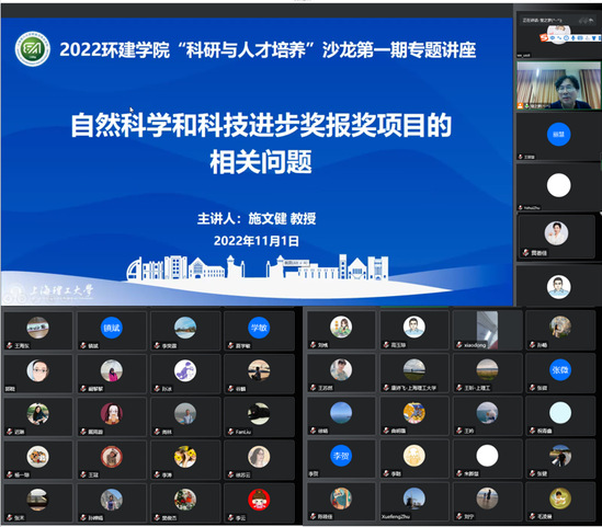 11月1日,环境与建筑学院启动2022年度“科研与人才培养”沙龙系列活动的第一期学术讲座,学院退休教授施文健作“自然科学和科技进步奖报奖项目相关问题”专题报告,学院近70位专业教师参与沙龙活动。讲座由学院院长黄远东主持,采用线上线下相结合的方式进行。
