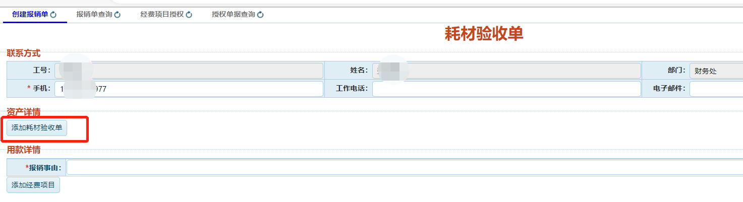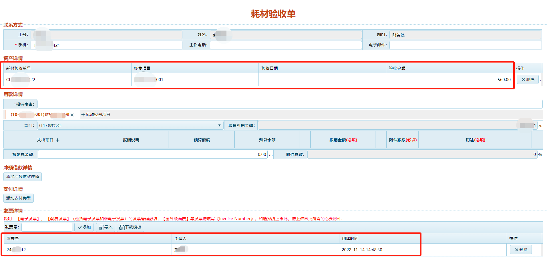 2.报销单中会自动带出验收单号、经费项目、验收金额、发票信息
