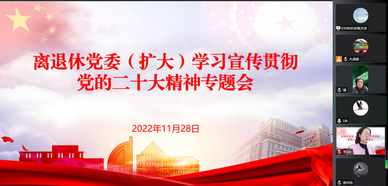 为深入学习宣传贯彻党的二十大精神,推进离退休干部工作高质量发展,11月28日,离退休党委召开线上全体委员(扩大)专题学习会,内容涵盖学习交流、支部学习情况、下一步工作设想等。老干办主任、离退休党委书记李景玉主持会议,全体离退休党委委员、离退休党支部书记等参加会议。