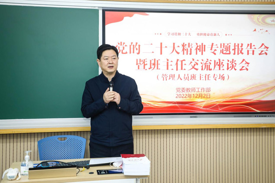 为深入学习宣传贯彻党的二十大精神,引领班主任以党的二十大精神为指引,不断提升理论素养和育人能力,12月2日,党的二十大精神专题报告会暨班主任交流座谈会(管理人员专场)在一教320教室举行。校党委副书记孙跃东、教师工作部负责人、学习贯彻党的二十大精神学校专家宣讲团成员牛翔宇以及全校各职能部门的班主任代表出席会议。