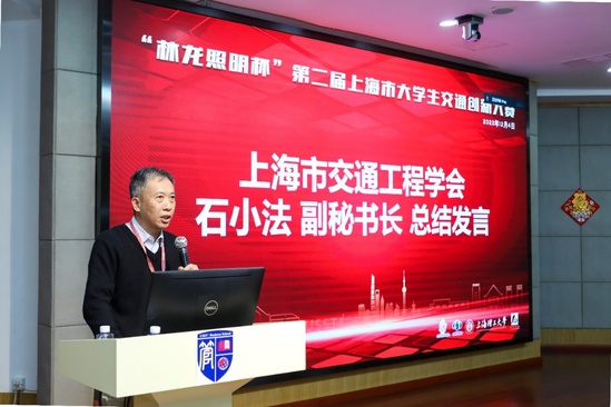 上海市交通工程学会副秘书长石小法在总结发言中对本次参赛作品给予了高度肯定,指出本次大赛充分响应了国家《“十四五”现代综合交通运输体系发展规划》提出的构建高质量综合立体交通网,加快智能技术深度推广应用,全面推进绿色低碳转型等战略目标,也充分展示了上海市交通运输相关专业大学生的创新能力与科研素养。最后,他代表主办单位宣布第二届年上海市大学生交通创新大赛圆满结束。