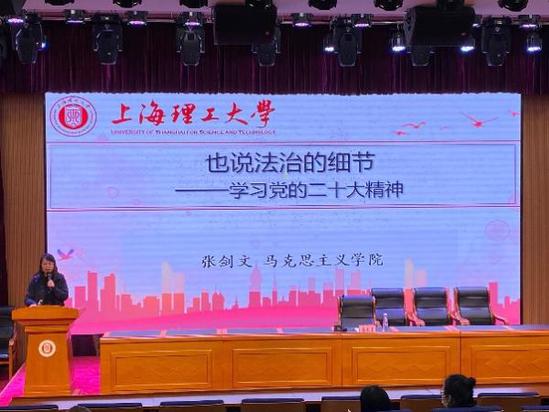 张剑文对王诗伊同学的宣讲表示肯定,并展开以“也说法治的细节——学习党的二十大精神”为主题的讲座,她围绕“党的二十大报告中的法治内容”“在法治轨道上全面建设社会主义现代化国家”“习近平法治思想是全面依法治国的根本遵循和行动指南”“国家、社会、个体与法治的关系”四个方面,用通俗易懂的语言和生动真实的案例,带领在场学生深入学习习近平法治思想,准确理解和把握宪法的精神实质及核心要义,并强调宪法对于保障公民基本权利、保持社会稳定、维护国家长治久安的重要意义,让宪法精神内化于同学们的心中。她指出,宪法作为我国的根本大法,是治国安邦的总章程。增强全社会的宪法意识,弘扬宪法精神,加强宪法实施和宪法权威对新时代中国特色社会主义发展具有重要意义。