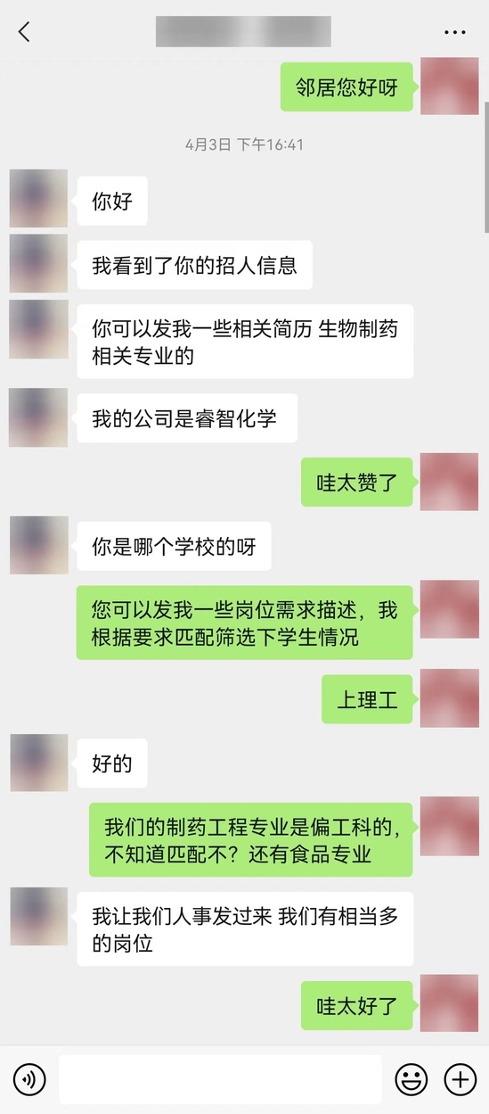 特别巧的是我正好住在张江,附近有很多生物医药公司。我就想,如果有邻居在这些企业上班,如果这些企业有招聘需求的话,那我把推荐毕业生的消息发在群里,说不定就有回应。