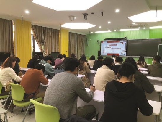 上海中医药大学“杏马”宣讲团到张江学区开展党的二十大精神主题宣讲,图为张江学区各中小学教师同步直播收看