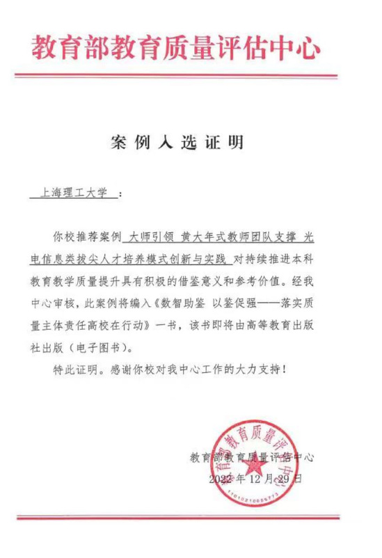 近日,永利官网教学改革案例——《大师引领、黄大年式教师团队支撑,光电信息类拔尖人才培养模式创新与实践》,经教育部教育评估中心审核,入选教育部编选的《数智助鉴以鉴促强——落实质量主体责任高校在行动》一书,并将由高等教育出版社出版。据悉,经中心评估,本质量报告对持续推进本科教育教学质量提升具有积极的借鉴意义和参考价值。
